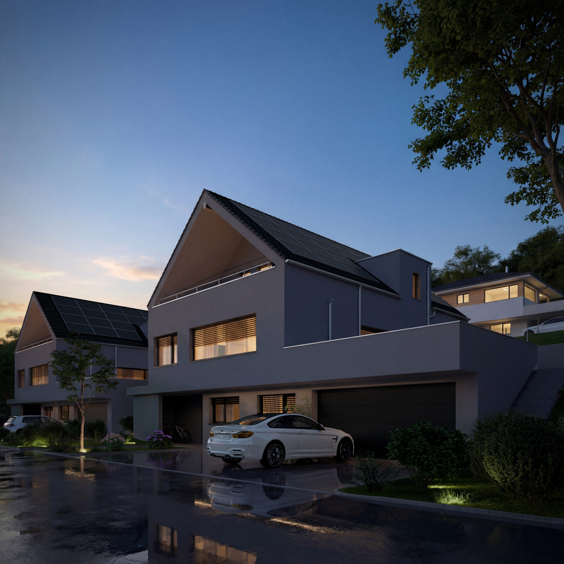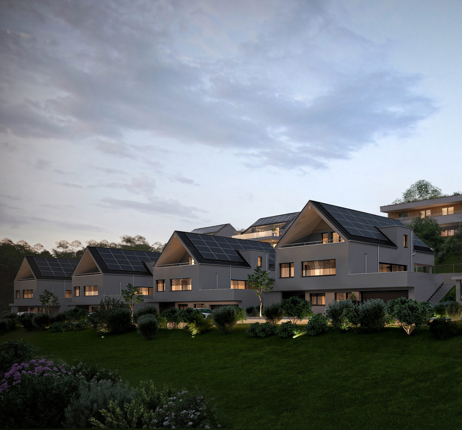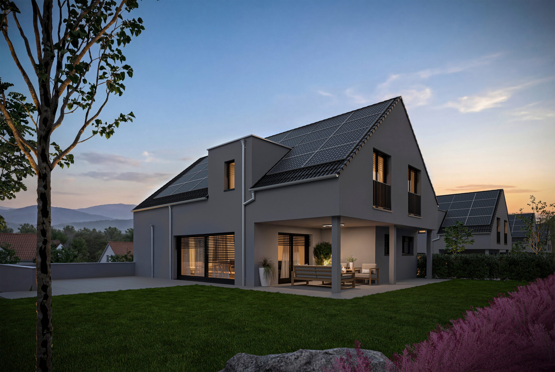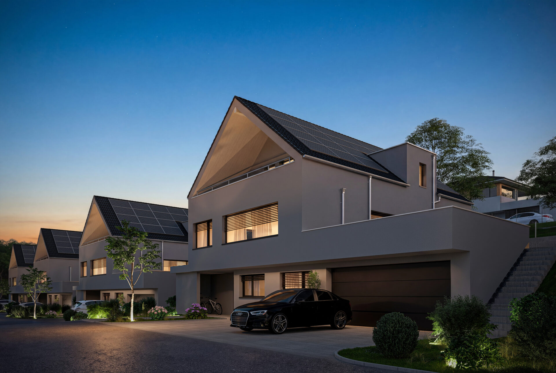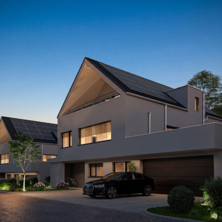 Moderne Ausstattung: Weisse Fassade mit Solarpanels auf dem Dach für nachhaltige Energiegewinnung