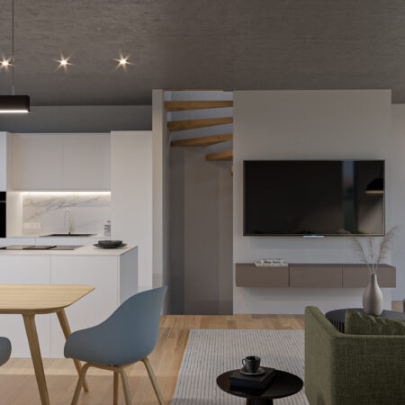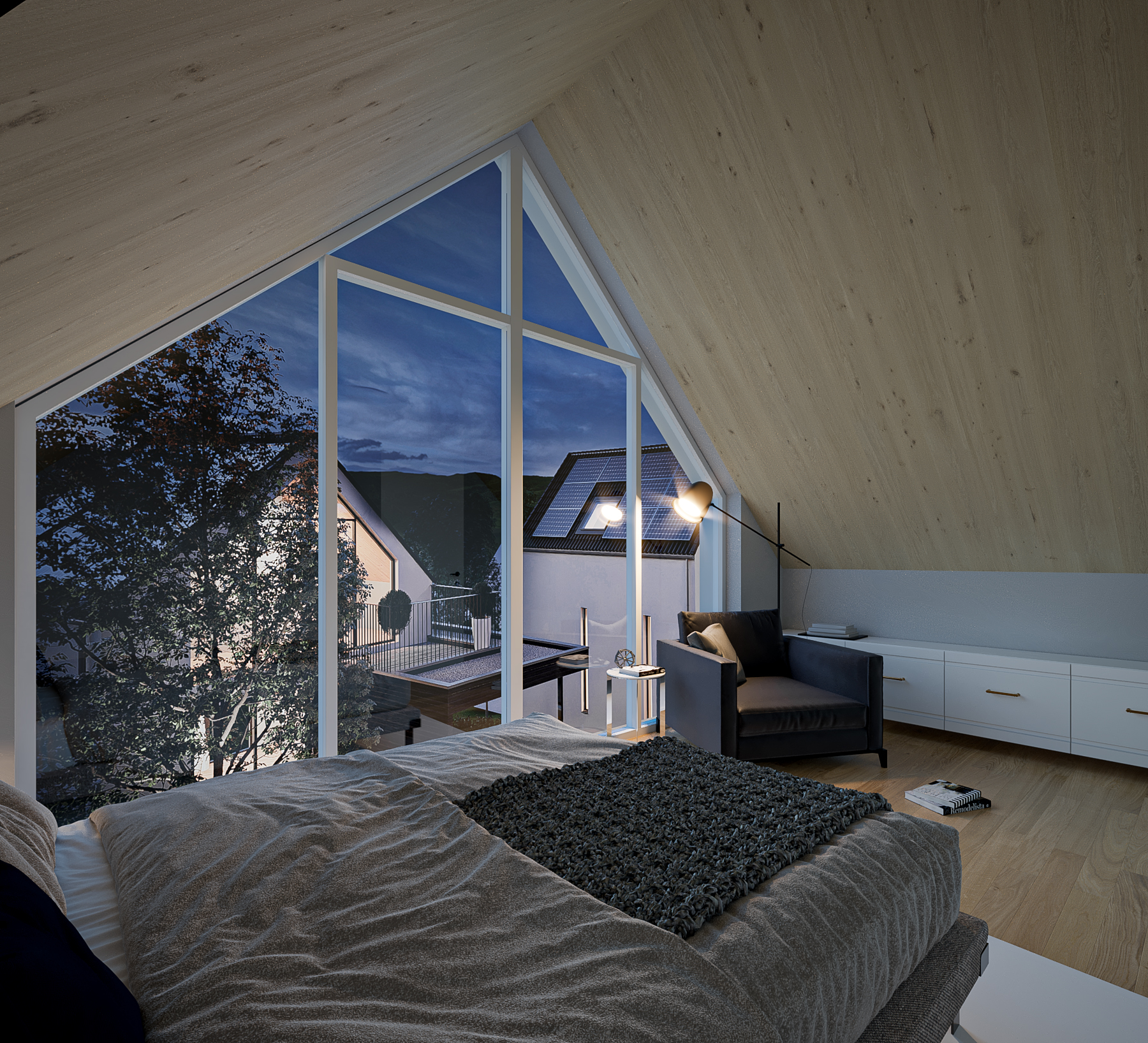 Jedes Haus verfügt über 4.5 Zimmer, darunter zwei Schlafzimmer mit einem gemeinsamen Bad. Im unteren Geschoss befindet sich ein vollausgebautes, beheiztes Zimmer mit eigenem Bad, das flexibel als Gästezimmer, Büro oder Hobbyraum genutzt werden kann. Der zentrale Wohnbereich mit offener Küche und gemütlichem Wohnzimmer bildet das Herzstück des Hauses.