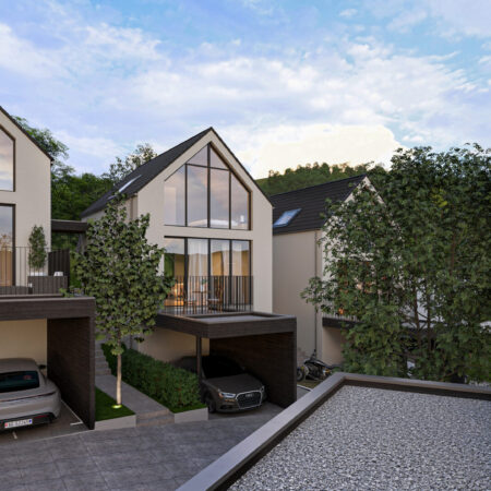 Sie verkörpern ein Wohnkonzept, das durch tiefe Verbundenheit mit der umgebenden Natur und eine klare, moderne Architektur geprägt ist. Angrenzend an einen wunderschönen Wald bietet diese kleine Wohnanlage einen Rückzugsort, der zugleich beruhigend und inspirierend wirkt.